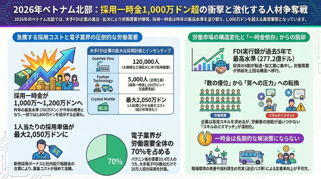 採用一時金の高騰は一時的な現象ではなく、ベトナム労働市場が「余剰から局所的な不足へ」「数の優位から質への圧力へ」と移行しつつある構造変化の表れとされています。